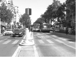 6 BRT systems need a segregated lane for buses that reduces friction with other road users. Such lanes can be accommodated on roads of different widths as one can arrange one-way or two-way systems. The accompanying photograph shows the introduction of dedicated bus lanes in the middle of boulevard Montparnasse in the centre of Paris. These bus systems have the following advantages:* BRT systems can serve the needs of medium sized cities all the way up to mega cities with a dense network of routes going close to passenger homes and destinations.