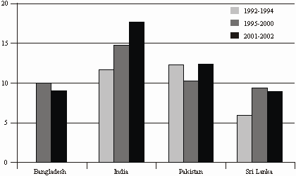 aradoxically, rates of graduate unemployment are high in many South Asian countries – 12% in India, 9% in Sri Lanka, and 8% in Pakistan; they are relatively low only in Bangladesh.7 On the whole, the rates of unemployment are higher among the more educated, increasing at higher levels of education (except in Sri Lanka); barring Bangladesh they reflect an increasing trend. It must however be noted that rates of unemployment are high only in the initial years, significantly falling subsequently, suggesting that high initial rates of unemployment should not detract the state from making heavy investments in the sector, as it is not higher education that creates unemployment.Despite the broadly accepted norm of spending at least 6% of national income on education, no country in South Asia except Maldives comes anywhere near that level. India spends about 3.5% of its GDP; Nepal and Bhutan spend a higher proportion, while Sri Lanka, Bangladesh and Pakistan allocate a low 2% to 2.2% of their respective GDP (Figure 4). Thus, financial priority for education remains lower than expected.