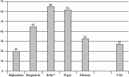 In terms of size, India has one of the largest systems of higher education in the world, with about 21 million students accounting for 86% of the total enrolments of the region in nearly 700 universities and 40 thousand colleges. Bangladesh and Pakistan are a distant second and third, with 2 and 1.8 million students respectively in higher education. Student numbers in Sri Lanka (0.23 million) and Nepal (0.39 million) are very small while Bhutan with only one university and Maldives with none rank at the bottom (Figure 1). The gross enrolment ratio ranges from about 10% in Pakistan and Afghanistan to above 20% in India, far below the ratio in many advanced counties; the world average being 31% with even the average of the developing countries being 25% (Figure 2).