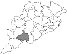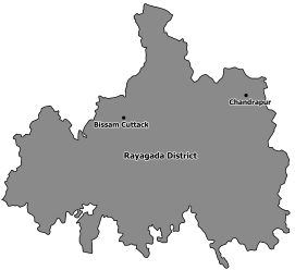 Map of India highliting Odisha state (top left); State of Odisha highlighting Rayagada district (bottom left); Rayagada district with Bissamcuttack and Muniguda blocks and the topographical layout (right). |