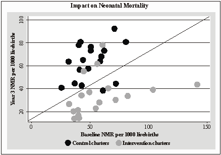 ccording to the Planning Commission, Jharkhand and Odisha are two of the poorest states in eastern India (with around 40% of their total combined population living below the poverty line). Census data shows that more than 20% of Jharkhand and Odisha’s population are Scheduled Tribes, and about 12% Scheduled Castes. As per NFHS 3, neonatal mortality rate (NMR) per 1000 live births was 49 in Jharkhand and 45 in Odisha, and maternal mortality ratio (MMR) per 100,000 live births was 371 and 358 respectively as compared to India’s national estimates of 39 per 1,000 for NMR and 301 per 100,000 for MMR.Ekjut’s initial work involved Participatory Learning and Action (PLA) during 2005-08 to reduce deaths of newborn babies as shown in the scatter-plot (Figure 1) comparing NMR in intervention and control clusters (panchayats) between the baseline and year three. Here, each dot represents a cluster and if all the dots fall on the line, it implies that the rates were the same in the baseline and in year three. Dots under the line represent clusters where the NMR was lower in year three than at the baseline.