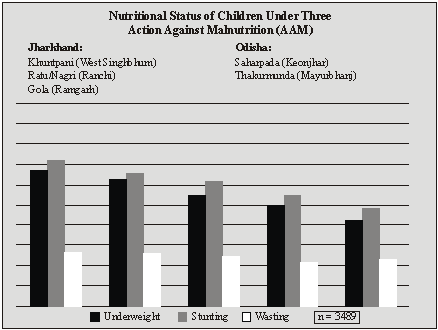 o maximize the impact of this intervention, community participation has been ensured through Participatory Learning and Action (PLA) exercises where the communities express their views, problems as well as possible solutions about health and nutrition concerns. Regular meetings of the community on malnutrition, childcare, child health and related issues are organized. In these meetings, information on nutrition, growth monitoring and related issues are discussed in order to facilitate community action, including finding local solutions out-side of current schemes and programmes. The AAM team also helps the gram panchayats to monitor programmes related to malnutrition and conduct social audits on programmes such as ICDS, PDS and MGNREGA. These are all part of the community mobilization process.Despite multiple programmes to improve nutritional status, much more needs to be done and achieved in both Jharkhand and Odisha. This was an opportunity for credible organizations to contribute through innovative community based solutions. Setting up crèches for six months to three year olds is one such innovative programme which addresses a number of determinants of child undernutrition and delivers good nutrition, clean and smoke-free environment, hygienic practices, regular growth monitoring and managing of at risk and malnourished children, and early childhood stimulation. Children with special nutritional needs and whose growth has faltered are fed three times a day. The community at every level extends support, including identification of location, provision of space, deciding on the menus and in management and supervision. Health check-ups are organized in partnership with the government and it is ensured that children access ICDS and other health services that they are entitled to.