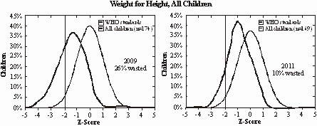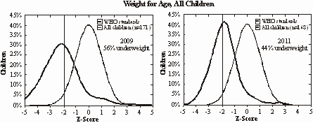 Graphs showing weight for age distribution of children going to JSS-run crèches in 2009, and the same cohort in crèches in 2011, compared to a standard normal population. In 2009, 56% of children were underweight, which reduced to 44% in 2011 in the cohort. |