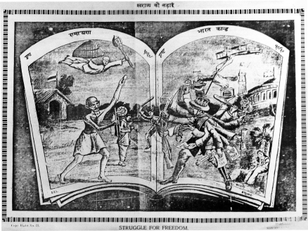 he iconography of such militant mobilization could again be familiar and outlandish in equal measure. Thus we have an illustration titled Swaraj ki Larai by one Prabhu Dayal, published as a single page broadsheet by Shyam Sundar Lal, ‘Picture Merchant’, Chowk, Cawnpore. Purporting to paint a ‘realist picture’ of the state of the country during the Civil Disobedience Movement, 1930-32, it opens a page from the Ramayan at ‘Bharat Kand’! On one page Gandhi is portrayed, his kutiya-hut in the background, wielding the charkha in a defensive posture.|
