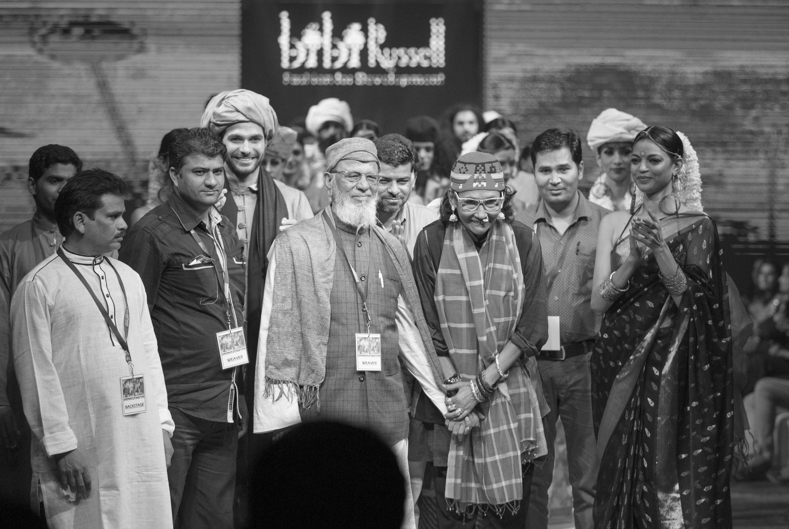Bibi Russell walks the ramp with master weavers at Handmade in Rajasthan, Jaipur, 2015. |