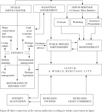 Another noteworthy achievement was that many organizations came together to advance this concern and effort – Jaipur Virasat Foundation, INTACH, Asia-Urbs team, among others. Figure I explains the connections between the various authorities to achieve urban conservation for the city of Jaipur by using the strategy of heritage walks. Figure II shows the methodology adopted by the authorities to achieve the holistic aim of making Jaipur a world heritage city.