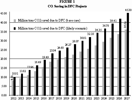 hus road vehicle displacement on to rail leads to substantial carbon saving in terms of fuel efficiency. A study by TERI pegs the minimum required cumulative CO2 emission reduction during 2001-2036 at 11 billion tonnes through various energy efficiency strategies, while sustaining an 8% annual growth rate. In this context while projects such as the National Solar Mission, nuclear power projects and adoption of ultra super critical technology for power plants and retro-fitment of existing power plants will help in meeting this target one must not forget that mega projects like DFC and HSTs offer carbon savings of a similar magnitude in the transport sector.These projects must facilitate stakeholder confidence since investments are dictated by rates of return and funds for financing by clearly defined project revenue streams. Policy supported low carbon mega rail projects will generate economies of scale for viable investment in rail based infrastructure – low carbon construction, fuel efficient rolling stock, hydel power equipment, solar photovoltaic cell manufacturing and other fuel efficient industries – enough to overcome the initially higher upfront costs. Assured patronage will also come from projects designed for intermodal shift. These projects are more amenable to branding and ability to give pass through rewards for patronage.