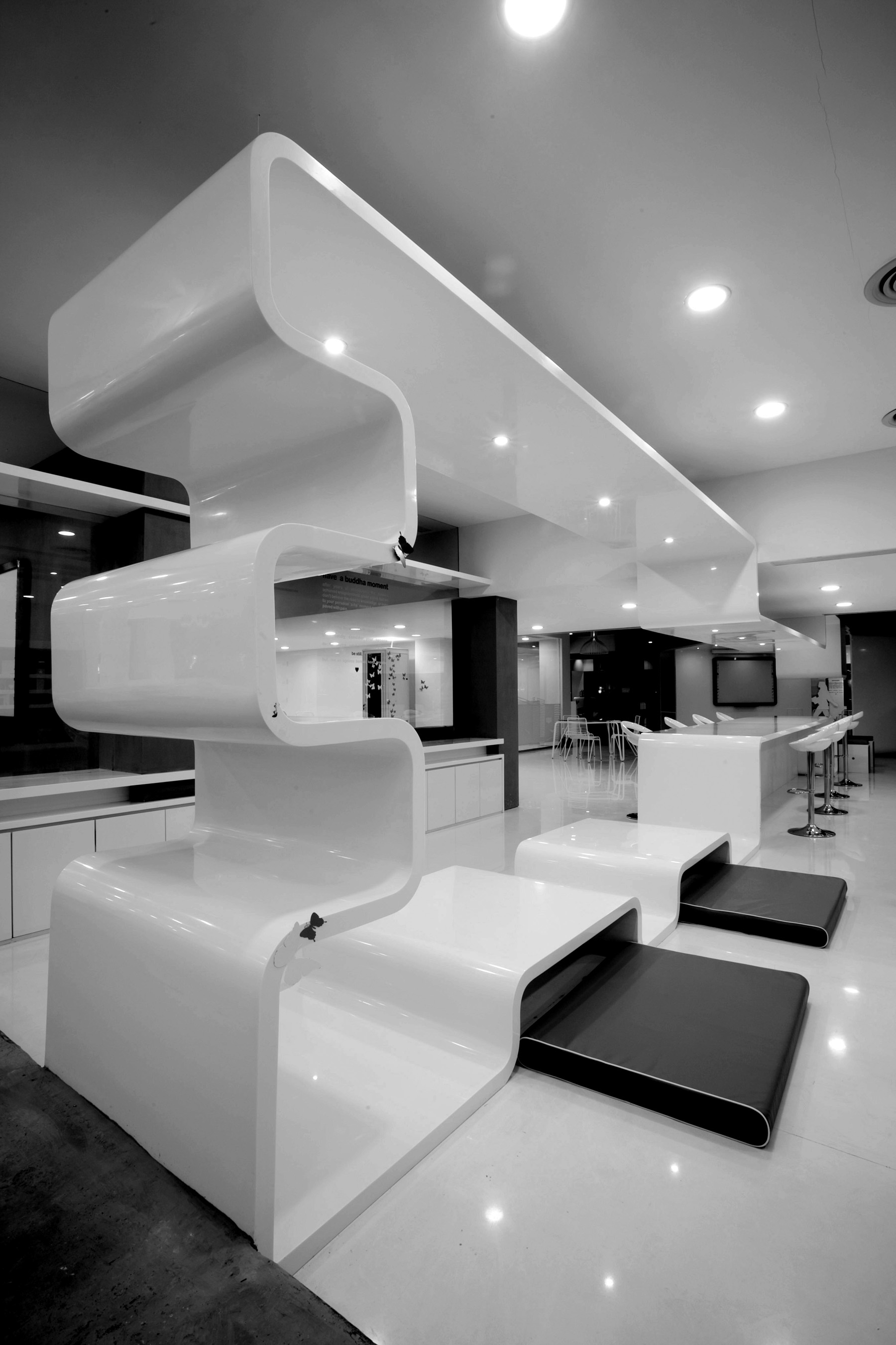 s a tool for workplace design, spatial behaviour is not merely intellectual abstraction. It is live and kicking in a number of corporate offices, many of whom I reviewed as part of my ongoing series on workplace design for Mint, the business newspaper. At the corporate headquarters of Tata Chemicals in Bombay House, Anuradha Parikh of Matrix Architecture drew on the company’s rural roots to create a ‘work village’, responding to the CEO’s desire for a space that would reflect the company’s business origins and build a sense of community among its people. A centrally located chauraha encourages spontaneous interaction, much like a village tree. Cubicles are lined with ledges, inspired by otlas or masonry projections found outside Gujarati homes to welcome visitors. Each desk has a lit cut-out, which can be personalized with a picture of a deity. Her interpretation of village social dynamics, and its application to a contemporary business setting, is subtle and effective.At the other end of the creative spectrum is the Godrej Space office in Mumbai’s Vikhroli, a radical suite of workspaces, defined by gleaming white finishes, fluid visual forms and a resolutely modern work culture. The versatile space operates as product showroom, working office, conference room, training centre and lounge. Its primary goal, though, is essentially narrative: its sponsors wanted to bring Godrej’s new brand identity to life in a cutting-edge, three-dimensional environment.