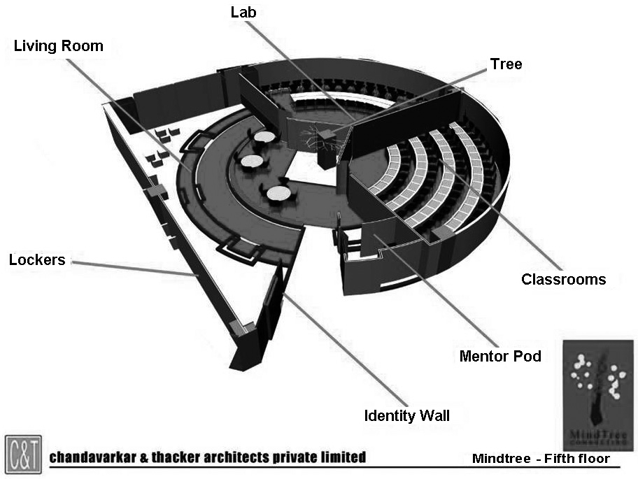 orkplace design experts Jeremy Myerson and Philip Ross provide a succinct classification of business objectives of modern workplaces in their book, The 21st Century Office.3 Their framework helps to bind CEO business vision with design elements. The duo writes that spaces can be ‘narrative, nodal, neighbourly or nomadic.’ A narrative office enables brand experience, the nodal office serves as a knowledge connector, the neighbourly office unfolds as social landscape, and the nomadic office performs as a distributed workspace. I would add more a further characterization: the nurturing office, devoted to enhancing individual well-being, inspired by MindTree’s approach.On their own, these terms do not roll off the tongue very easily, and may not ignite a lively conversation between CEOs and architects. However, when supplemented with metaphors derived from spatial behaviour-led thinking, a more practical vocabulary emerges. The accompanying table connects the dots between business objectives, types of spaces and design solutions using spatial behaviour-led metaphors.