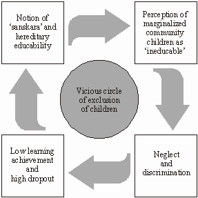 he belief in the notion of sanskara and inherent ‘uneducability’ of children from marginalized communities adversely affects the nature of teacher-student relationship as well as the overall school ethos and environment. In our study schools it was found that teachers generally did not indulge in any overt acts of discrimination or violence against children from marginalized communities. The discriminatory behaviour by teachers, such as unnecessary and excessive beating/corporal punishment to marginalized community children, engaging them specially in performing such tasks as sweeping the school, back-row seating arrangement for them in the classroom etc., which have been reported by other studies on school education, were not being practiced in our study schools. Instead, teachers were found to have developed an attitude of sheer neglect towards children from marginalized communities and had very low or no expectations of learning achievement from these children.Neglect by teachers in classrooms and schools severely affects the self-worth of these children and further alienates them from and pushes them out of the schools. This whole phenomenon takes the shape of a vicious circle as shown in the accompanying diagram.