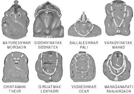 The worship of Ganesha reached its height in Maharashtra. The Ashta Vinayak (fig. 16) – Mayureshwar, Chintamani, Mahaganapati, Siddhivinayak, Vighneshwar, Girijatmak, Balleshwar and Varadvinayak – are all situated in villages around Pune, the seat of Shivaji, the Peshwas and Maharashtrian culture, which travelled around the Deccan during the Maratha period.