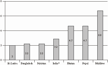 aradoxically, rates of graduate unemployment are high in many South Asian countries – 12% in India, 9% in Sri Lanka, and 8% in Pakistan; they are relatively low only in Bangladesh.7 On the whole, the rates of unemployment are higher among the more educated, increasing at higher levels of education (except in Sri Lanka); barring Bangladesh they reflect an increasing trend. It must however be noted that rates of unemployment are high only in the initial years, significantly falling subsequently, suggesting that high initial rates of unemployment should not detract the state from making heavy investments in the sector, as it is not higher education that creates unemployment.Despite the broadly accepted norm of spending at least 6% of national income on education, no country in South Asia except Maldives comes anywhere near that level. India spends about 3.5% of its GDP; Nepal and Bhutan spend a higher proportion, while Sri Lanka, Bangladesh and Pakistan allocate a low 2% to 2.2% of their respective GDP (Figure 4). Thus, financial priority for education remains lower than expected.