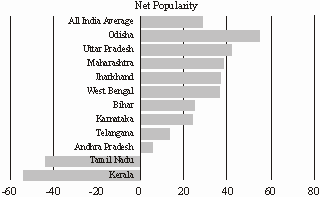 he BJP ran a presidential type of campaign, not only highlighting the leadership and performance of Modi but also implicitly comparing him with the Congress President Rahul Gandhi as part of the campaign rhetoric. For making sense of popularity, a simple Modi popularity index was created by subtracting the popularity of Modi from that of Rahul Gandhi. A negative score indicates that Rahul Gandhi was more popular compared to Modi. In states where the net popularity is high, we should expect the BJP to make gains.Modi was generally more acceptable across the country, and our selected states followed the same pattern as with satisfaction with the central government. In Uttar Pradesh, Jharkhand, Maharashtra, West Bengal and Odisha, the net popularity of Modi was much higher than the national average. In our perfect closed party systems in Kerala and Tamil Nadu, Rahul Gandhi was way over Modi. Modi was slightly more popular in the Telegu speaking states of Andhra Pradesh and Telangana, but much below the national average.