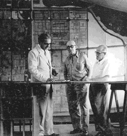 P.L Verma, Le Corbusier and Pierre Jeanneret at the drafting table. |