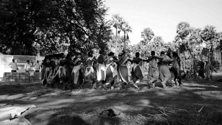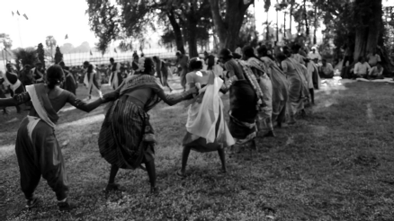 2 ‘O rela-rela relela-rela… Kondamodalu kona ostaneelo Kondamodalu-kona osto… neelo…’, they sang. The dance-space was circular, and the women held each other around their arms as they went around. As their voices grew louder and the beat turned, almost imperceptibly, to a faster pace, some other women joined in, voluntarily, and left, after dancing a while.The circle expanded, and contracted, continuously. There was freedom: to ‘join in’, or ‘let go’, as and when they wished. Neither the rhythm, nor the pace, nor even the synchronicity of this space was impacted by the free ‘entering’ and ‘exiting’, which signified the dreamt-of, aspired-to space; a space that neither confines nor imprisons, within its centre. There was an existing idea of commune and community in their dance (then, at a certain point in history, there arrived a political idea: Communism, the basis having existed already in their culture), and the song had a regular reference to Kondamodalu, this village, this land.